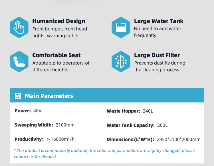 It is a relatively popular sweeper has high cleaning efficiency of vacuum, sweeping and watering. Designed with enlarged chassis, the sweeping width is 2000mm, which offers high work efficiency. Use of high-performance maintenance-free batteries, featured by no leakage and no harmful gases.    The large-capacity dustbin design can clean a larger area at one time, without dumping garbage frequently, and improve work efficiency.