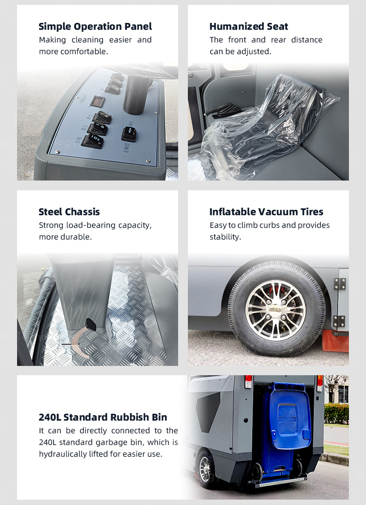 1000L dust bin pure electric road sweeper features a stylish design and flexible operation. This sweeping vehicle is suitable for outdoor cleaning operations in cleaning companies, property management companies, parks, sanitation, rural streets, sidewalks, squares, and universities.   This all-weather sweeper has a generous appearance and flexible operation.    Based on the current working characteristics of sanitation workers, we independently developed and produced an electric garbage sweeper that combines sweeping, vacuuming and watering to automatically clean the floor.