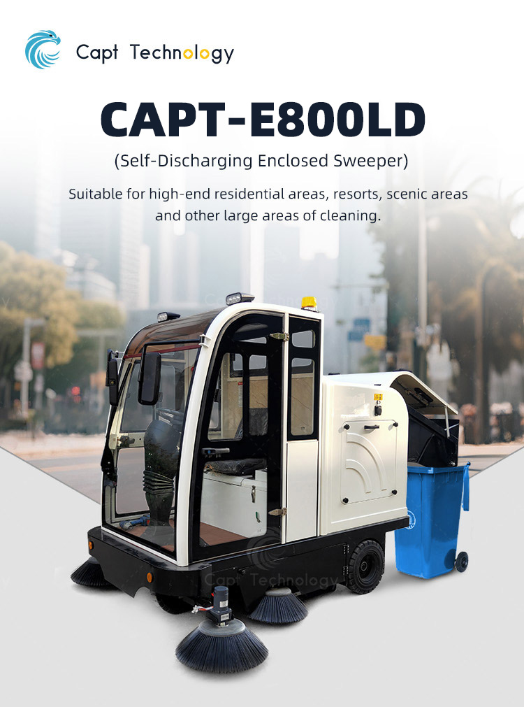 CAPT-E800LD self-discharging enclosed sweeper adopts fully enclosed cab design,and it is mostly suitable for using in extremely cold and harsh environment. Mostly for outdoor use, suitable for high-end residential areas, resorts, scenic areas and other large areas of cleaning.