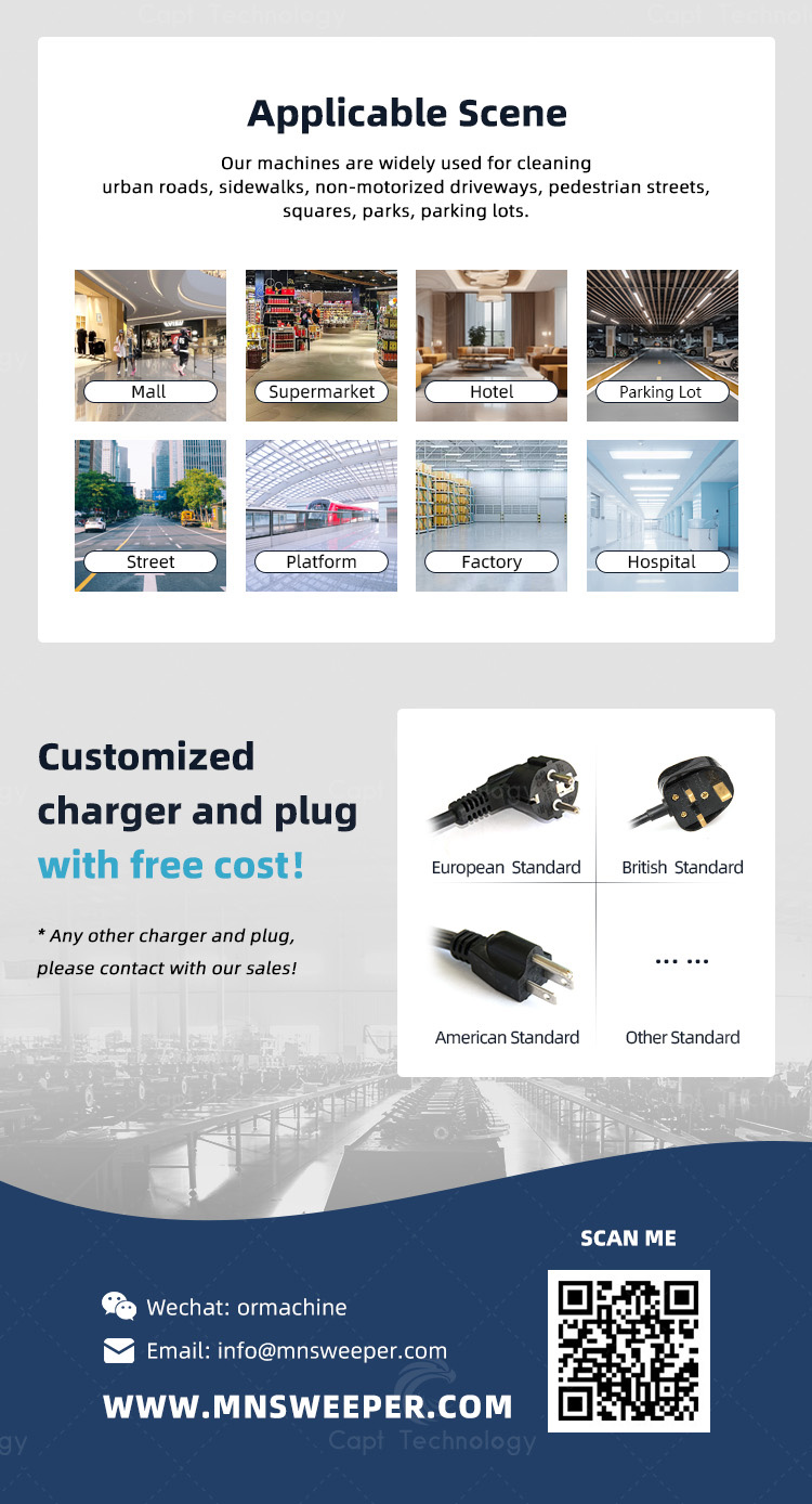 This sweeper is small and flexible, can turn on the spot, and can enter the elevator, especially suitable for working in small spaces, such as various office buildings, shopping malls, hospitals, schools, sidewalks, etc.