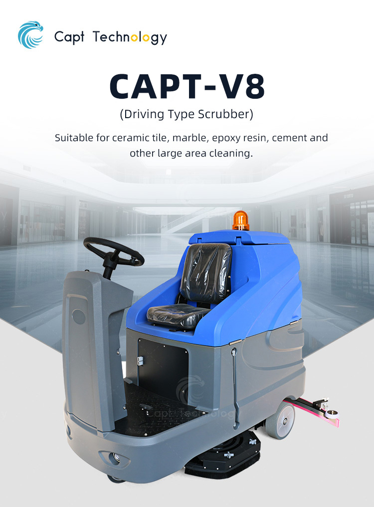 The ride-on floor scrubber V8 is powerful, and capable of cleaning requirements in the industrial environment of heavy oil. Besides, it has enough compactness and flexibility to deal with the large area of cleaning task quickly and effectively. It is mainly used in shopping center, departure hall, factory and logistics warehouse.