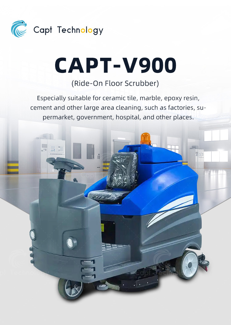 The ride-on floor scrubber CAPT-V900 is especially suitable for ceramic tile, marble, epoxy resin, cement and other large area cleaning, such as factories, square, supermarket, government, hospital, school, hotel, airport, subway, terminals and other places.